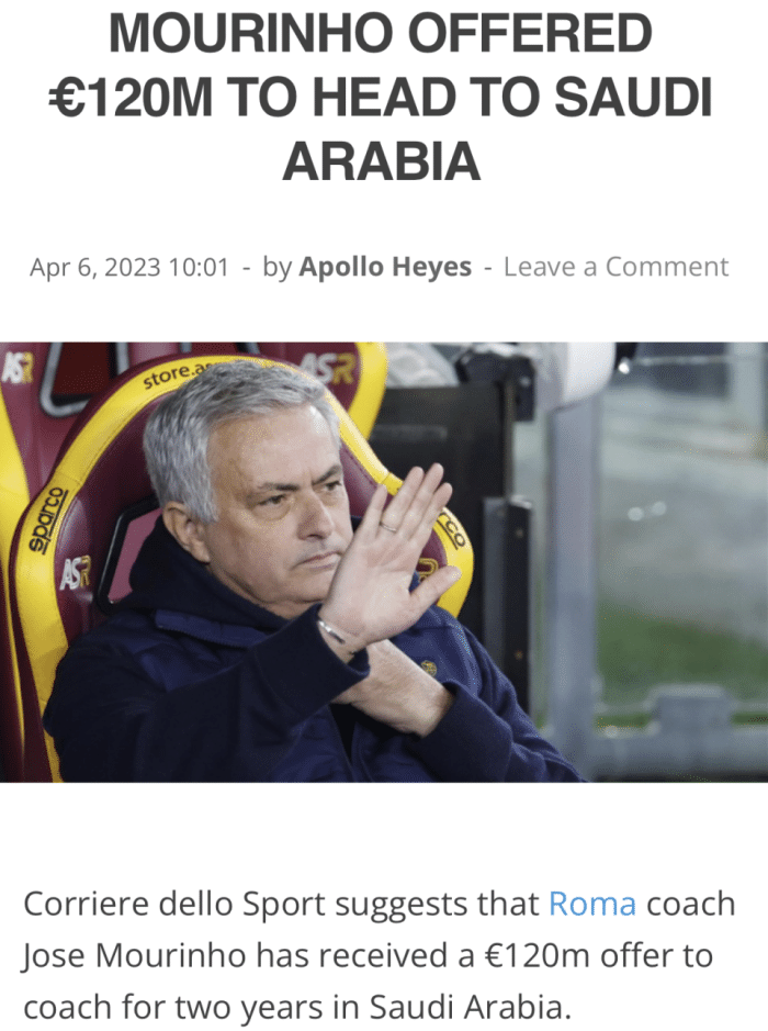 北京时间4月6日,来自意大利知名媒体《罗马体育报》的消息,沙特足协高层向穆里尼奥开出一份令人咋舌的报价,邀请他执教。罗体表示,穆里尼奥正在和团队的工作人员,认真考虑这份邀约。