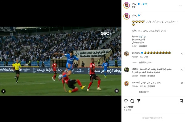 或许是争冠希望渺茫,让葡萄牙巨星C罗内心有些郁闷,赛后,有球迷在社交媒体上发文对本场比赛,利雅得新月单场3次获点球提出质疑时,C罗也现身在这篇帖子下的评论区。C罗直接连发了9个“笑哭”的表情,显然同样也是想表达质疑和不满。