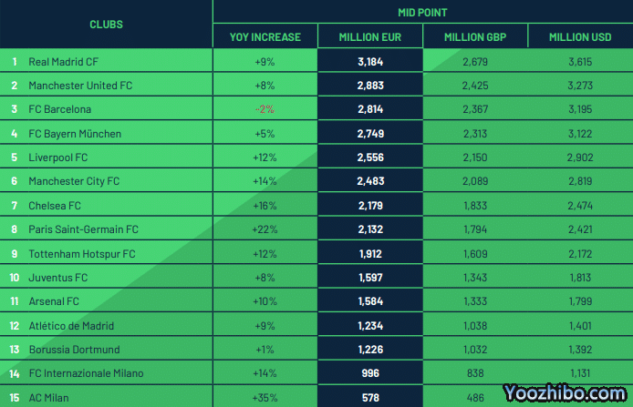 排名榜单第二位的是英超豪门曼联,尽管净亏损超过1亿欧元,不过曼联的企业价值仍高达28.83亿欧元,反超巴萨升至次席。上赛季曼联获得英超第二名以及欧联杯亚军,得以在本赛季重返欧冠赛场,这也使得红魔在财政收入方面有所增益。