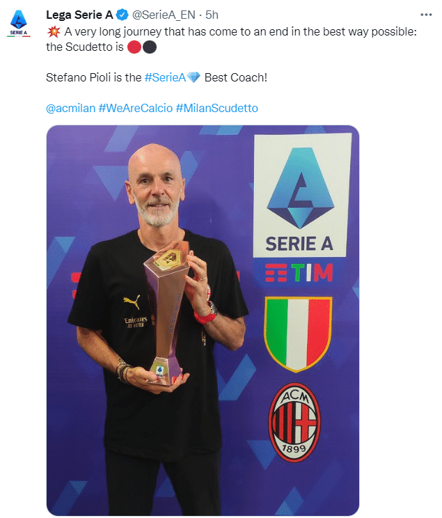 24直播网05月23日讯 意甲官方消息,AC米兰主帅皮奥利当选意甲赛季最佳主帅。