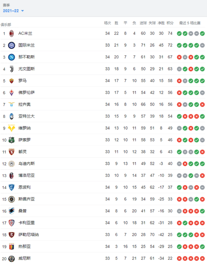 目前米兰34轮74分排名第一,国米33轮72分排名第二,两队的争冠大战还在继续。