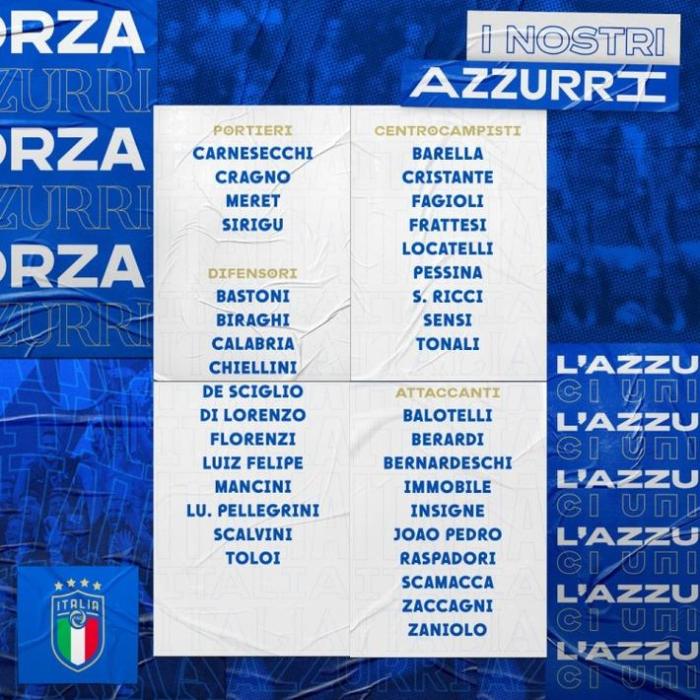 后卫:巴斯托尼(国米)、比拉吉(佛罗伦萨)、卡拉布里亚(AC米兰)、基耶利尼(尤文)、德西利奥(尤文)、迪洛伦佐(那不勒斯)、弗洛伦齐(AC米兰)、路易斯-费利佩(拉齐奥)、G-曼奇尼(罗马)、卢卡-佩莱格里尼(尤文)、斯卡尔维尼(亚特兰大)、托洛伊(亚特兰大)