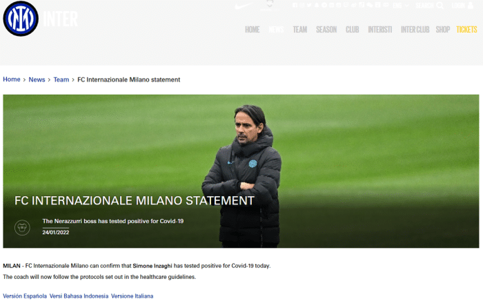 24直播网01月25日讯 据国际米兰俱乐部官方消息,球队主帅西蒙尼-因扎吉新冠检测呈阳性。