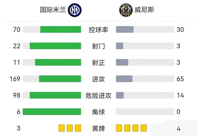 全场比赛结束,国际米兰主场2-1逆转威尼斯。