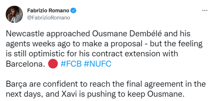 罗马诺表示,纽卡几周前联系过登贝莱和他的经纪人,并且给出了报价,但巴萨方面对于他的续约依然感到乐观。