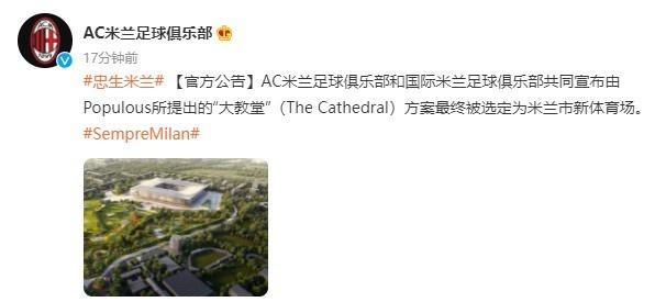 米兰双雄将在当地合建一座新球场,由Populous提出的“大教堂”已被选定为最终方案。