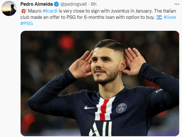 阿尔梅达表示,伊卡尔迪现在接近在一月份加盟尤文图斯,尤文方面希望租借球员半年直到本赛季结束,合同中含有非强制性买断条款。