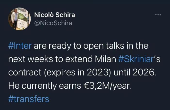 斯基拉表示,国米已经准备好在未来几周开启与什克里尼亚尔的续约谈判。