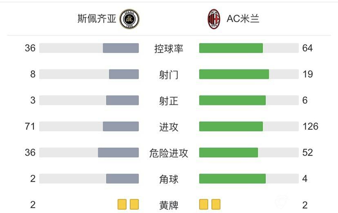 下半场补时三分钟,第92分钟,莱奥接迪亚斯大范围转移右脚弧线球偏出球门。最终全场比赛结束,斯佩齐亚1-2米兰。