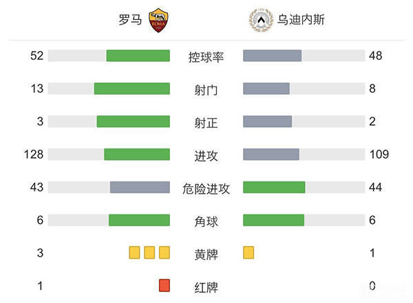全场比赛结束,罗马主场1-0小胜乌迪内斯。