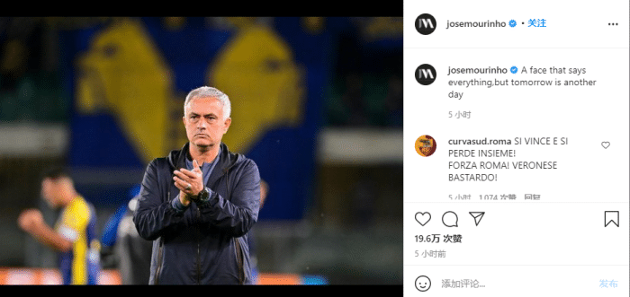 这是穆里尼奥带领罗马在正式比赛中尝到的首场败仗,赛后穆帅更新了自己的Instagram账号,晒出一张自己脸色凝重的照片,并写道:“表情说明了一切,但明天又是新的一天。”
