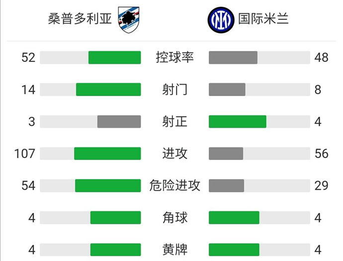 第33分钟,桑普多利亚角球机会,禁区内两队球员连续争顶,随后球到了吉田麻也脚下,吉田麻也推射破门,桑普多利亚1-1国米。