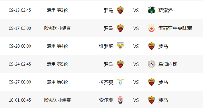 而从赛程安排来看,罗马还有一个小魔鬼赛程,球队在意甲第六轮要迎来罗马德比,球队要客场对阵拉齐奥;随后第七轮对阵恩波利之后,在第八轮要客场迎战尤文,跟着第九轮主场对阵那不勒斯;第十轮对阵卡利亚里之后,第十一轮要主场迎战米兰。这段赛事,罗马对阵的强队很多,而这段时间罗马的战绩或许会影响罗马本赛季的走势。