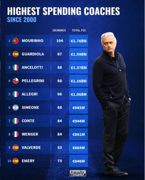 1、穆里尼奥,104笔签约,17.6亿欧