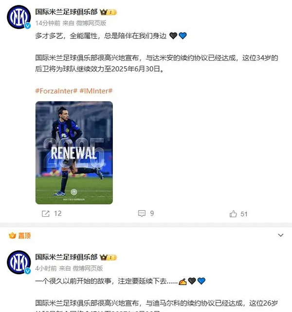 24直播网12月31日讯 ,国际米兰足球俱乐部官方宣布,分别与达米安、迪马尔科续约至2025年和2027年6月30日。