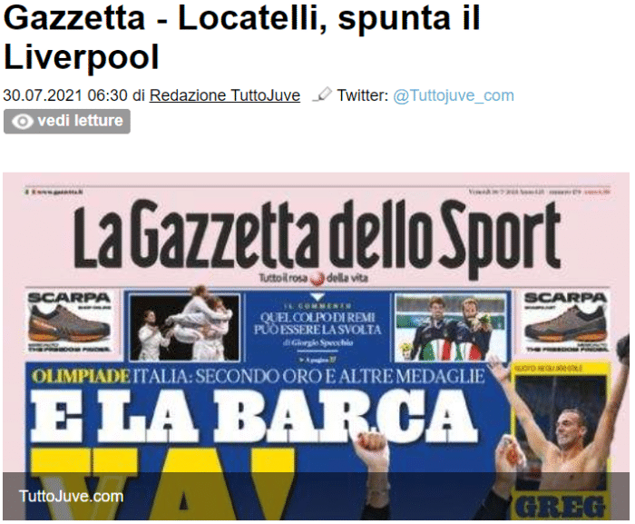 24直播网讯 据《米兰体育报》头版消息,利物浦已经加入到了萨索洛中场洛卡特利的争夺战当中,他们企图截胡尤文图斯。