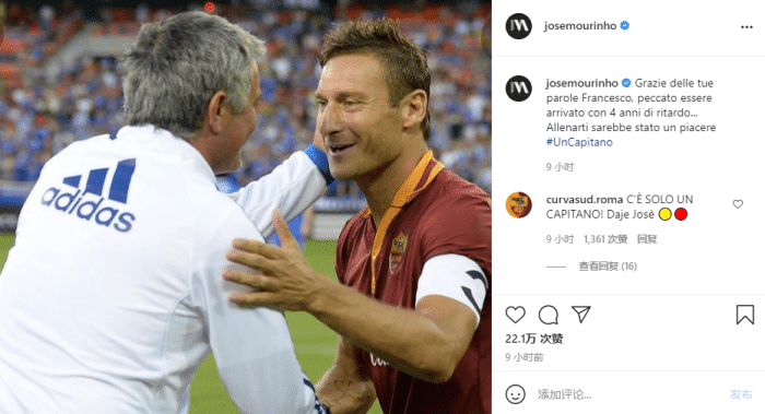 24直播网讯 今天,穆里尼奥在Instagram上称赞了托蒂,并表示自己无法亲自执教托蒂是一种遗憾。
