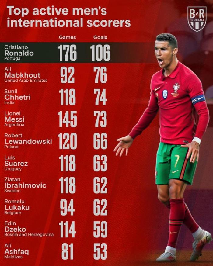 C罗在昨天凌晨葡萄牙3-0匈牙利的比赛中上演梅开二度,将自己的国家队进球数提高到106个,他距离追平阿里-代伊创造的国家队进球纪录仅差3个。