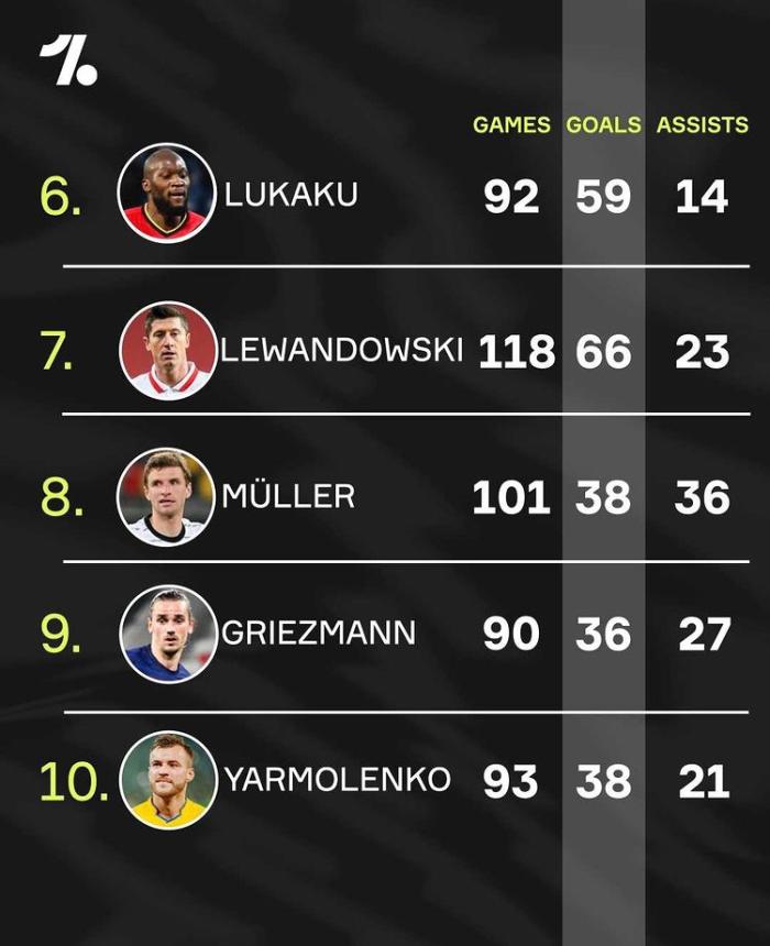 而C罗之后是卢卡库,他92场比赛打进59球助攻14次,制造了73球,场均制造0.79球。第七是莱万,他118场比赛打进66球助攻23次,制造了89球,场均制造0.75球。第八是德国的穆勒,他出场101次打进38球助攻36次,制造了74球,场均制造0.74球。第九是格列兹曼,他出场90次打进36球助攻27次,制造了63球,场均制造0.7球。第十的则是亚尔莫连科,他93场比赛打进38球助攻21次,制造了59球,场均制造0.63球。