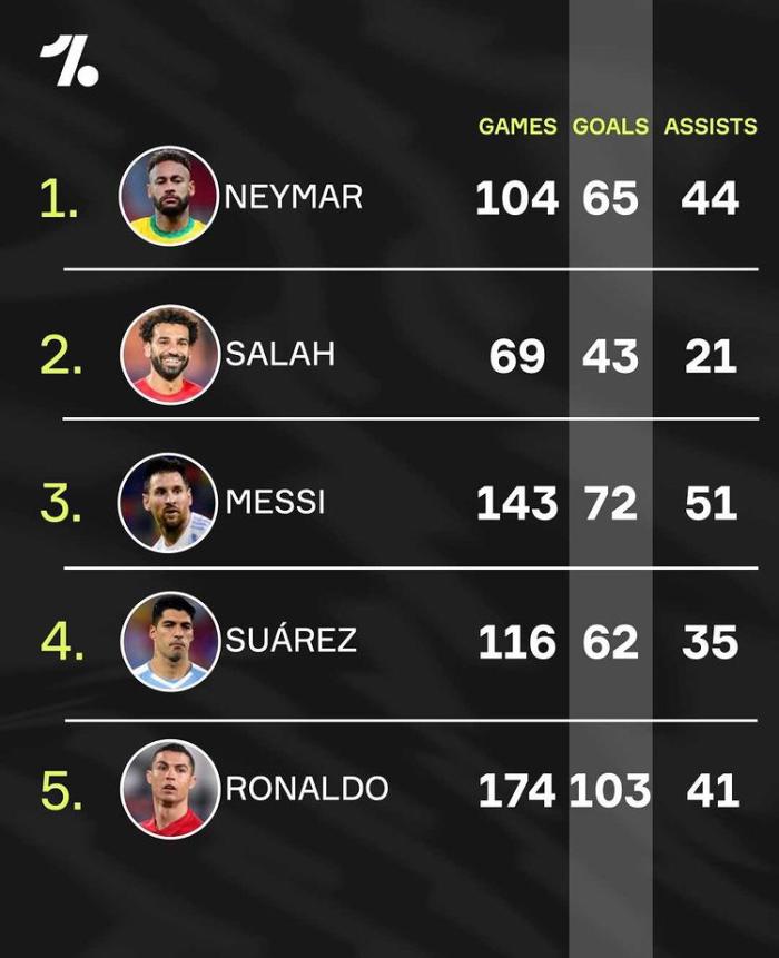 内马尔是国家队效率王,他参加了104场比赛打进65球助攻44次,制造了109球,场均制造进球数量超过了1球。而排名第二的则是萨拉赫,萨拉赫出场69次,打进43球助攻21次,一个人制造了64次,场均制造0.92球。而排名第三的是梅西,他参加143场国家队比赛,打进72球助攻51次,制造了123球,场均制造0.86球。而第四的是苏亚雷斯,他116场比赛打进62球助攻35次,制造了97球,场均制造0.83球。而第五的才是C罗,他175场比赛打进104球(图中数据少了本场比赛)助攻41次,制造了144球,场均制造0.82球。