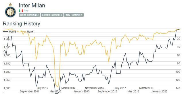 接下来的几年里,凭借管理层、俱乐部工作人员以及全体球员和教练组的努力,国米的竞技水平稳步上升,终于在2019年11月重返世界前十的行列。去年7月,蓝黑军团凭借在欧战和联赛中的稳健发挥,世界俱乐部排名在五年里第一次超过了死敌尤文。