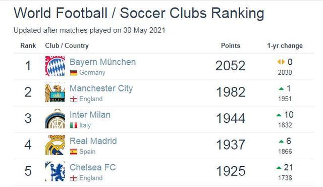 24直播网讯 在五月过去后,著名数据网站Football Database又一次更新了最新的世界俱乐部排名,国际米兰上升一位,来到了世界第三位,仅次于拜仁与曼城,并力压意大利的其他球队,高居本国第一。