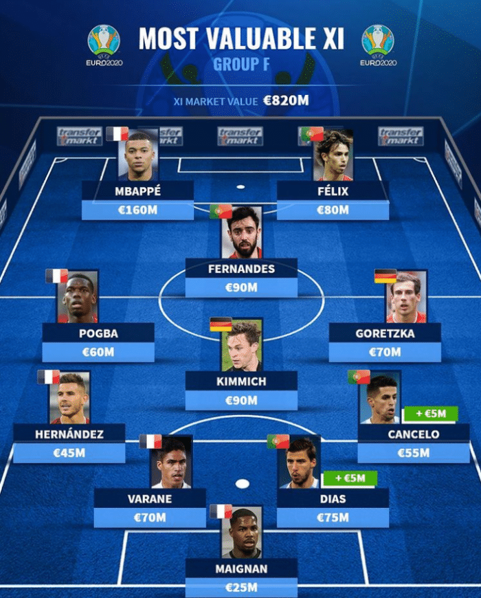 拥有法国、德国、葡萄牙和匈牙利的F组是本届欧洲杯的死亡之组,今天德国转会市场盘点了该小组的最贵阵容,C罗、诺伊尔无缘。