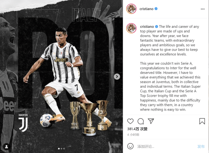 24直播网讯 C罗写道:“任何一个顶级球员的职业生涯都是有高有低的,每个赛季,我们都与拥有高水平球员和极大野心的球队交手,所以我们总是必须拼尽全力,来保持在最佳水平。”