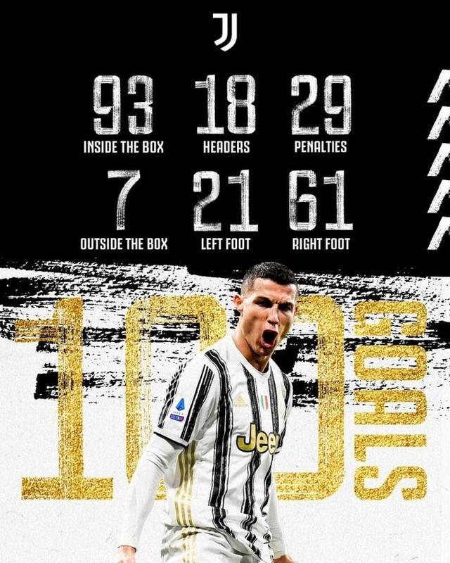具体的进球方式上,这100粒进球的分布为18粒头球,21粒左脚进球,61粒右脚进球,29粒点球得分。