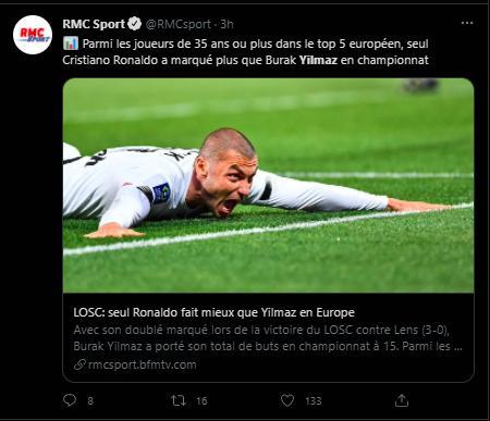 据Opta统计,本赛季五大联赛35岁以上球员中,3伊尔马兹的联赛进球数仅次于36岁的C罗,C罗目前收获27球。