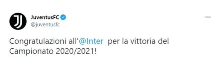 来自意甲对手尤文官方也发出了祝贺:恭喜国米成为2020/21赛季意甲冠军。