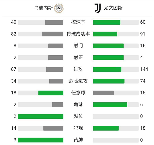 全场比赛结束,尤文2-1逆转战胜乌迪内斯。