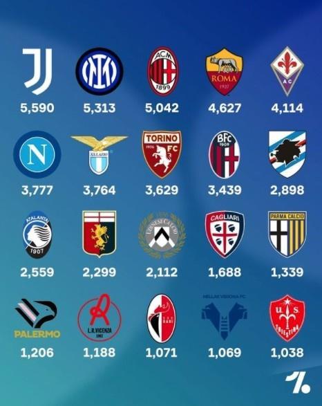24直播网5月2日讯 近日,意大利媒体onefootball盘点了意甲历史总积分榜,尤文、国米、米兰位列前三,罗马第四。