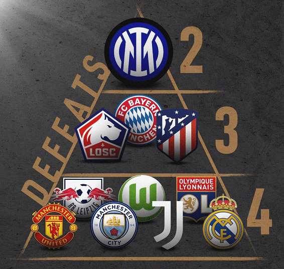 24直播网讯 本赛季,欧洲五大联赛基本上要结束了,而各大球队的表现也基本上定性了。那么,谁是本赛季五大联赛表现最好的球队呢?而近日,就有欧洲媒体用金字塔的方式,对各大球队的输球场次进行了一个排行,其中国米是在塔尖的存在,而第二档则是马竞、拜仁和里尔。这些球队都是各自联赛表现最好的球队了。好了,话不多说,一起看数据。