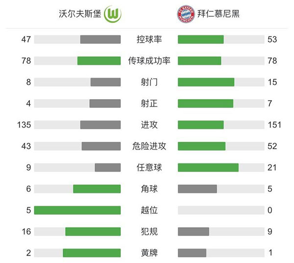 全场比赛结束,拜仁慕尼黑客场3-2战胜沃尔夫斯堡。