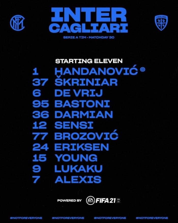 24直播网讯北京时间4月11日18时30分,意甲第30轮,国际米兰将在主场迎战卡利亚里。赛前,比赛双方公布了本场比赛的首发阵容。