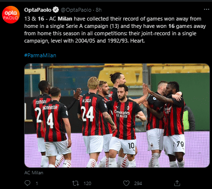 24直播网讯北京时间4月11日,意甲第30轮,米兰客场3-1战胜帕尔马。据Opta统计,米兰本赛季已经16次在客场拿下胜利,其中13次都是在意甲联赛中取得。