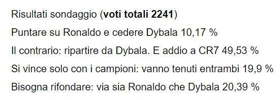 24直播网讯近日,意大利媒体《全市场》发起一项投票调查,近一半的球迷投票选择出售C罗,留下迪巴拉,只有10%的球迷选择出售迪巴拉,留下C罗。