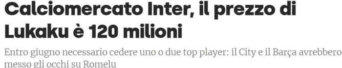 24直播网4月3日讯 据意大利媒体《罗马体育报》报道,国米可能被迫在今夏出售1-2名顶级球员,卢卡库被标价1.2亿欧元。