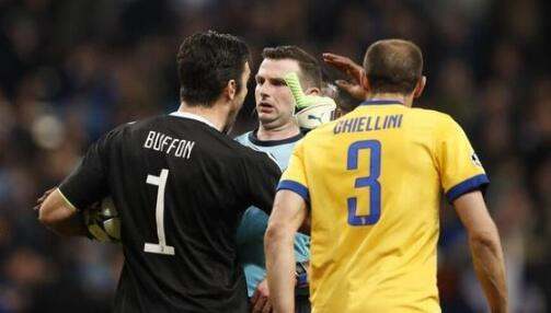 原来,在欧冠1/4决赛次回合,皇马主场1-3负于尤文图斯,但凭借首回合的3-0的比分,皇马4-3惊险的淘汰对手挺进四强并最终夺冠。比赛的最后时刻,因为对主裁判吹贝纳蒂亚禁区里犯规并给了皇马点球的决定不满,布冯冲上前找裁判理论,但因冲撞裁判被当值主裁奥利弗出示红牌罚下。替补门将什琴斯尼出场但没守住的点球,皇马依靠这一点球绝杀淘汰尤文。
