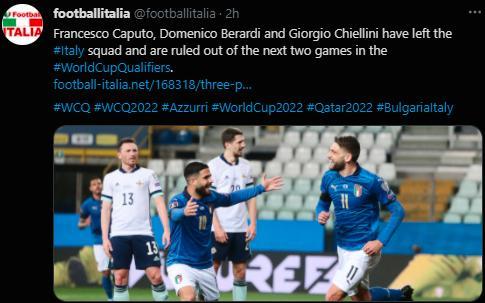 24直播网讯据意媒报道,基耶利尼、贝拉尔迪、卡普托这三名球员因伤离开了国家队,返回各自俱乐部,他们都不会参加接下来意大利在客场对阵保加利亚和立陶宛的比赛。