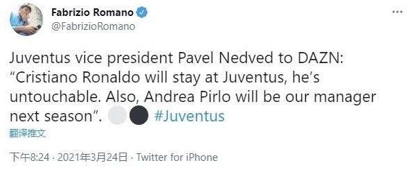 24直播网3月25日讯 ,知名记者罗马诺在个人社交账号上发文透露,尤文副主席帕维尔-内德维德,已经在接受DAZN的采访时声称,下赛季C罗将会继续留在尤文效力。而备受争议的尤文主帅皮尔洛,也将会带队征战下赛季。内德维德更是用了100%,来形容皮尔洛继续执教尤文的可能。