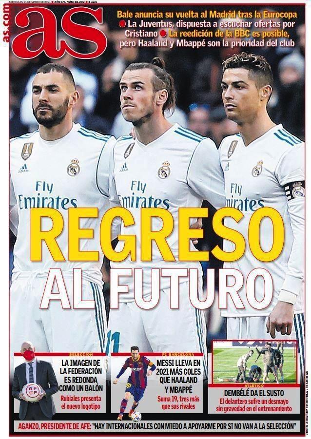 当然如果C罗真的在今夏回归皇马,相信皇马方面依然会热情的欢迎他回归。西班牙知名媒体《阿斯报》就已经在头版畅想皇马下赛季重组BBC三叉戟。贝尔日前已经表示下赛季要回皇马了,如果C罗也回到了伯纳乌,BBC三叉戟将会再次联袂出战,这确实让不少怀旧的皇马球迷很是期待。