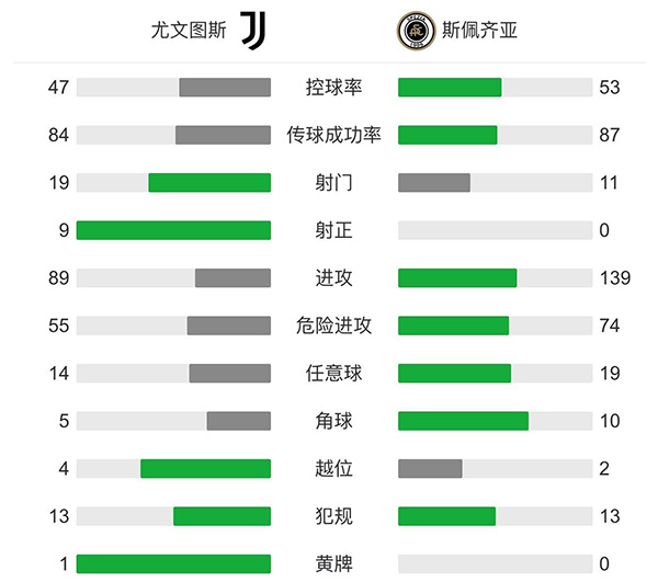 查看:尤文图斯vs斯佩齐亚 全场录像技术统计: