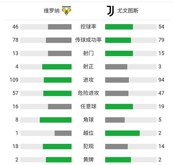 查看:维罗纳vs尤文图斯 全场录像技术统计: