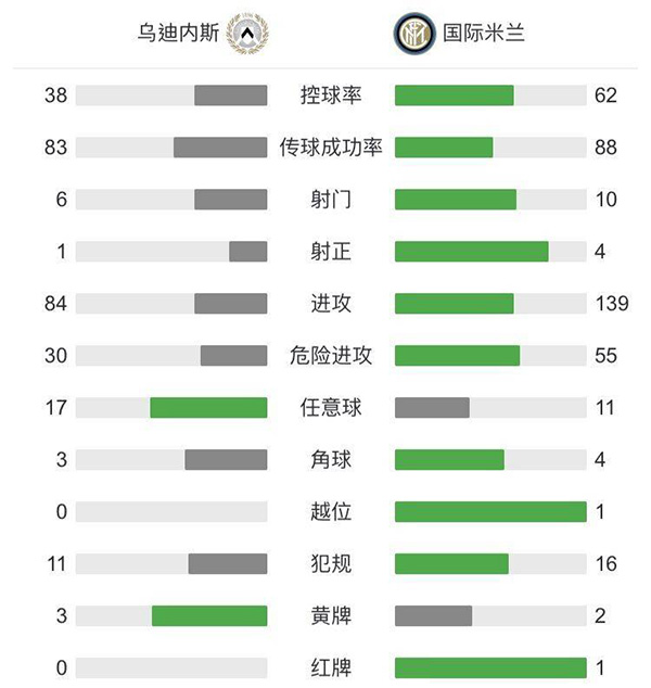 查看:乌迪内斯vs国际米兰 全场录像技术统计: