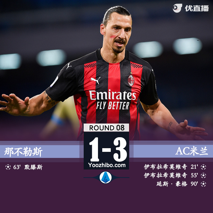第54分钟,AC米兰第2球!伊布!禁区内左侧雷比奇斜挑,远端伊布垫射破门!AC米兰2-0那不勒斯!