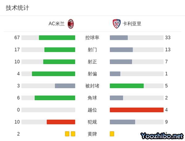 第86分钟,奥卡福左路单车突破下底送出传中,后点普利西奇停球抽射被米纳解围,但是裁判手表提示球已经进了,AC米兰5-1卡利亚里↓