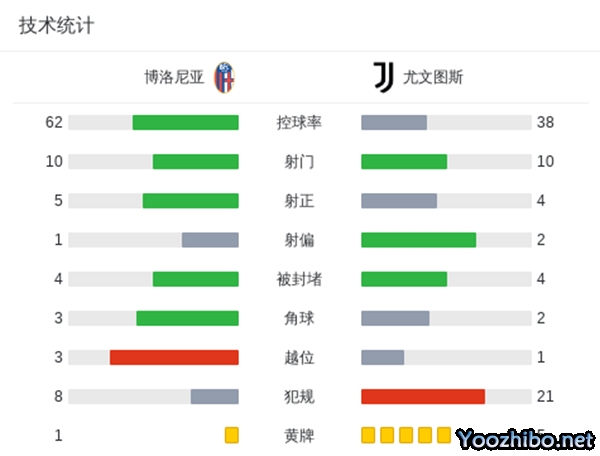 第2分钟,博洛尼亚角球机会造成尤文禁区内乱战,卡拉菲奥里中路迎球推射入网,尤文0-1落后。
