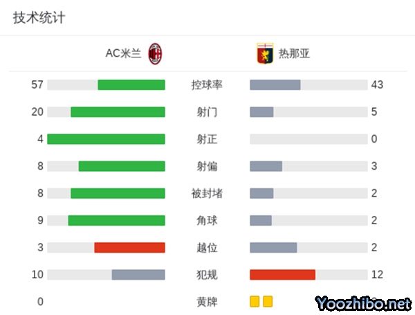 最终米兰20脚射门无果,0-0战平热那亚,无缘各项赛事连胜。
